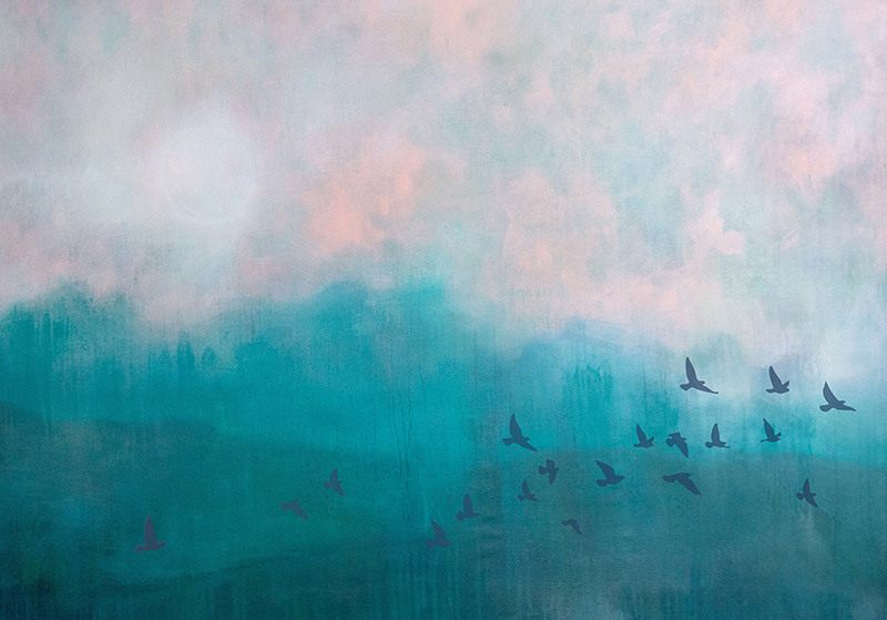 Hills in the Mist with Birds, 42 x 60, acrylic, 2025, SOLD“10 of 30,” 40 x 40 in, acrylic, 2025, SOLD